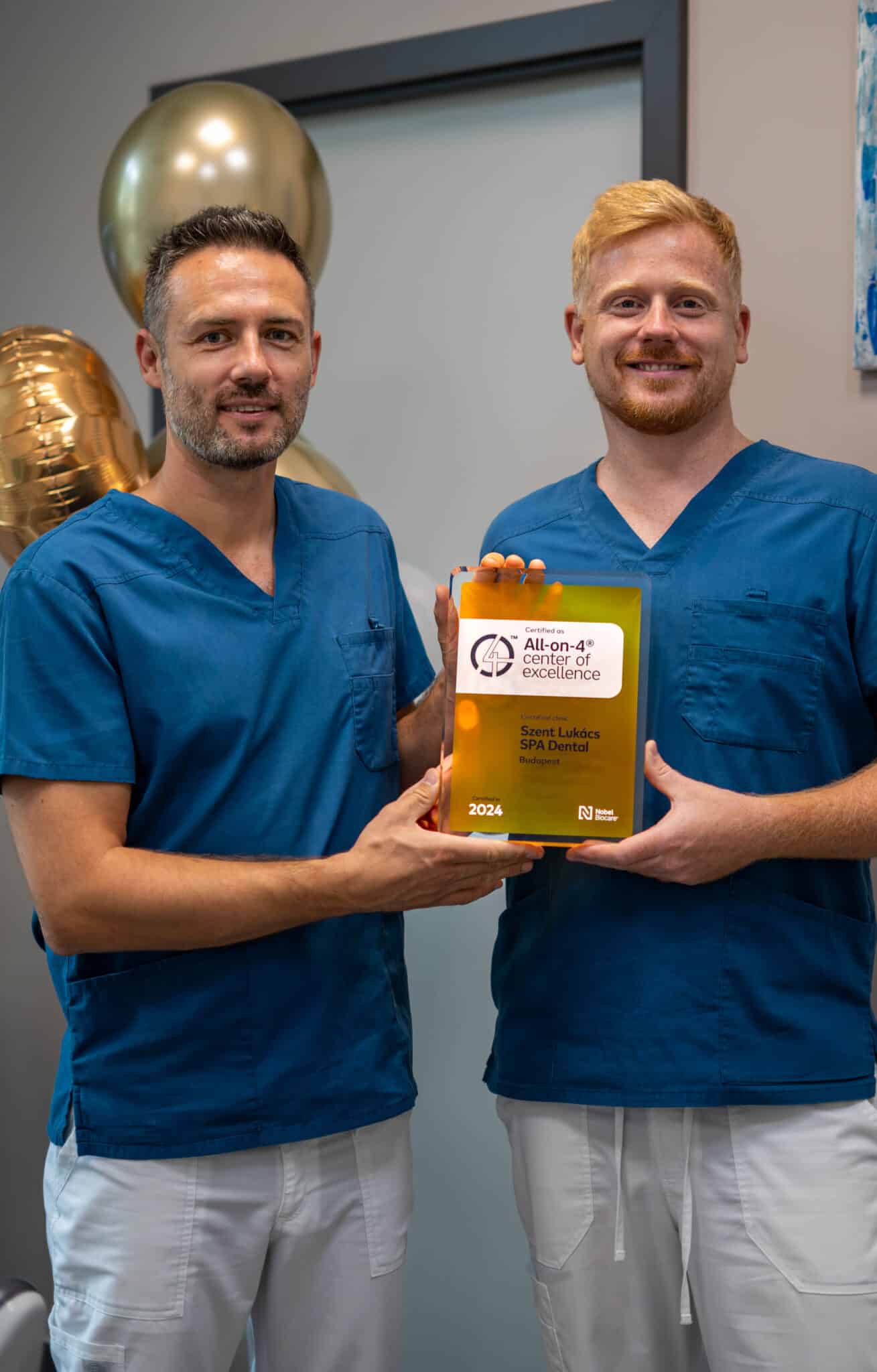 A Szent Lukács SPA Dental 2024-ben megkapta a fogászati rehabilitációban való kiválóság díját a Nobel Biocare-től. A fotókon a rendelő két implantológusa Dr. Ruszin Tamás és Dr. Nagy Róbert látható.